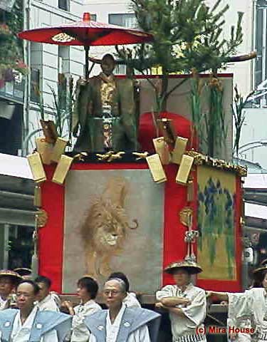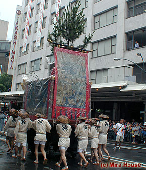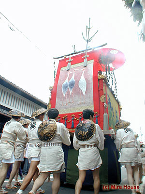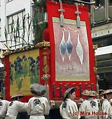 ![]() 摂津の国・難波に住む貧しい夫婦を語る謡曲「芦刈」が由来。 ご神体の人形と衣装は戦国時代の作品で,山鉾の中でも屈指の古さ。 |