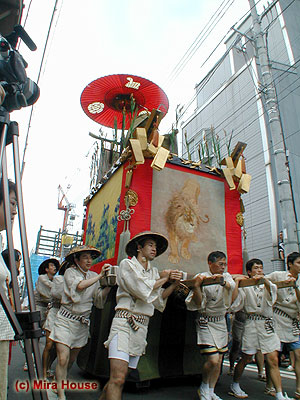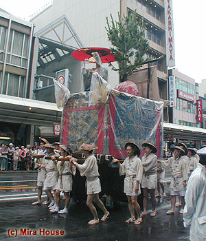 | 2002年の巡行では旧装飾品が用いられていたが,雨のためビニールシートに覆われていた。 | |
