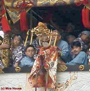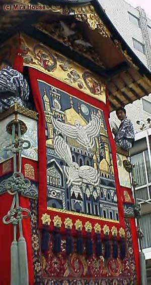 以前は長刀鉾と同様に生稚児が乗っていたが,1929(昭和4)年以降,操りの稚児人形に変えられた。稚児人形は,久邇宮多嘉王(くにのみやたかおう)殿下によって三光丸(さんこうまる)と命名され,巡行の時には稚児のように鉾の上で稚児舞いができるように作られている。 異国情緒豊かなフクロウの見送は,皆川泰蔵による麻にロウ染めの「バグダッド」で1982(昭和57)年製。古見送の錦綴双鳳唐子遊楽図は,1828(文政11)年に京都西陣で作られたもの。 下水引は,以前は与謝蕪村(1716-83)下絵の琴楳書画図であったが,1991(平成3)年に栂尾高山寺の国宝「華厳宗祖師絵伝図」を下絵にした綴織を新調。 花文様の前懸及び胴懸は,インドやペルシアの絨毯。旧胴懸として,16世紀製の描絵玉取獅子,牡丹,鶴文様の朝鮮毛綴が保管されている。 |