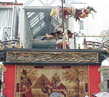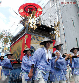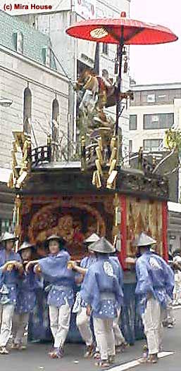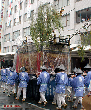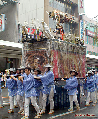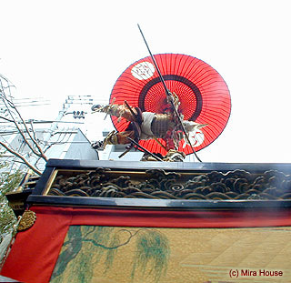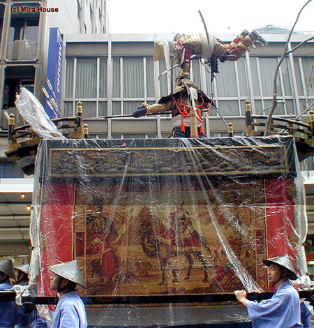御神体は,浄妙坊が橋桁を渡って一番乗りをしようとしたところ,一来法師が「悪しう候,御免あれ」と声をかけて浄妙坊の頭上を飛び越え先陣をとった瞬間の両者の姿をとらえている。このため,かつてこの山は「悪しゅう候山」とも呼ばれていた。 胴懸は,1985(昭和60)年に新調された長谷川等伯原画の「柳橋水車図」の綴錦織で,宇治川にちなんでいる。古胴懸はビロード織の「琴棋書画図」。 水引は,波濤文様の彫刻が用いられており,宇治川らしい雰囲気を醸し出している。 見送は,当町に住んでいた本山善右衛門が織った「雲龍文」で,かがり織という非常に特殊な手法で織られた逸品。 山の趣向にちなんで,宵山では勝ち守りが授与され,土産物としてTシャツなどのグッズも売られる。 | |