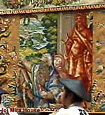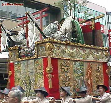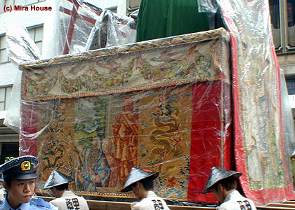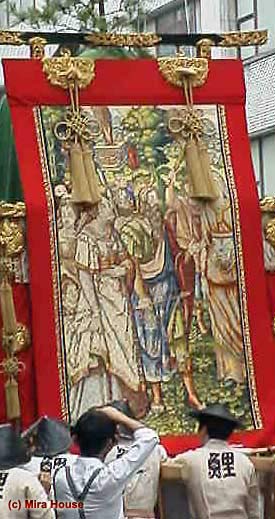 鯉山の象徴とも言える躍動感あふれる鯉の像は,八幡山の鳩と同じく左甚五郎の作。滝に見立てた白麻緒を勇ましく睨みつけている。 前懸・胴懸(2枚)・水引(2枚)・見送は,重要文化財に指定されている16世紀のベルギー・ブリュッセル製毛綴“トロイア王の図柄”で,1枚の毛綴織を分割裁断したもの。ベルギー王室美術歴史博物館の調査によると,古代ギリシアの詩人ホーロメスの『イリアッド』(イーリアス物語:トロイア戦争などを描く前8世紀頃のギリシアの長編叙事詩)の一場面,トロイア最後の王プリアモスと后ヘカベーの姿を描いているということだ。 滝を上る鯉の山にふさわしく,欄縁その他の金具は全て波濤文様。 | ||