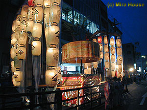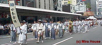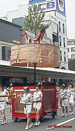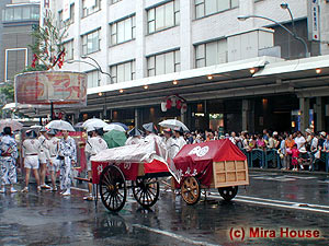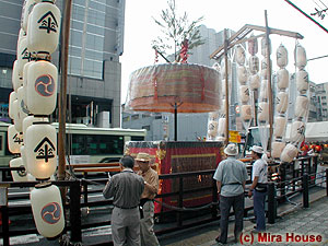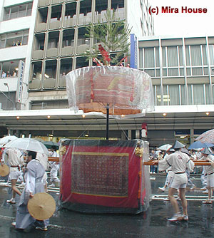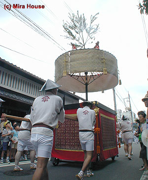 応仁の乱以前より巡行に参加しており,傘と棒振り囃子は古い鉾の形態の一つ。祇園唐草模様の大傘に錦の垂(さがり),傘の上に御幣と若松を飾る姿は,傘鉾の原形を伝えている。1988年に復元した踊りは,子ども8人が赤熊(しゃぐま)鬼面の棒振りなどを演じる。 元治の大火の後も巡行に加わっていたが,明治5年以降,道具類もちりぢりになって休み鉾となっていた。1985年に傘鉾本体が再興されて路上に飾る居祭の形で祇園祭に復活し,1988年,傘鉾の巡行に欠かせない棒振り囃子の復元と共に117年ぶりに巡行へ復帰。棒振り囃子は室町時代に京都から広まった風流踊で,滋賀県甲賀地方に今も伝わる“ケンケト踊り”が復元の元になった。 |