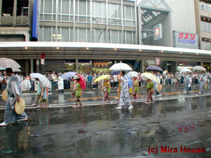![]() 雨の中を歩く棒振り囃子の子どもたち。 |