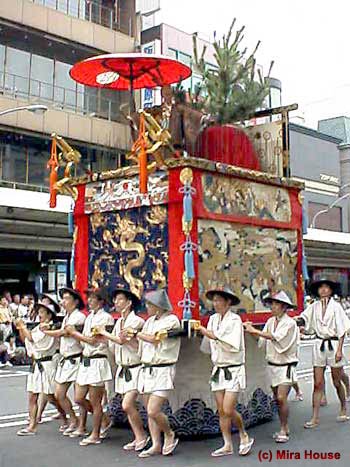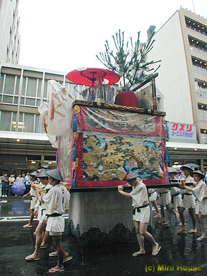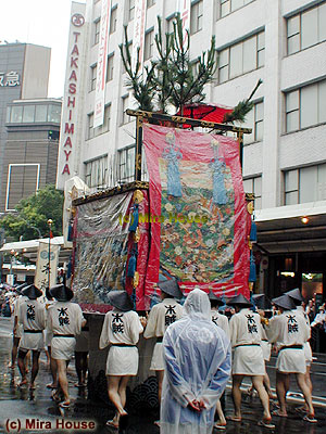 | 雨が降っても巡行は変わらず行われるため,貴重な装飾品はシートで保護される。 | |