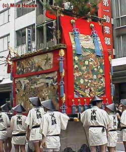 前懸は,「唐人交易図」刺繍。 見送は,中国明代の「鳳凰牡丹図」綴織を1983(昭和58)年に復元新調したもの。旧見送としては,仙人聞香図(せんにんぶんこうず)の錦綴がある。 水引は,道釈(どうしゃく)人物刺繍と1999(平成11)年に復元新調された「日輪鳳凰文様」。旧水引には,中東幾何学文様イギリス織絨毯。 欄縁金具は雲龍模様で,角房金具は唐団扇型。 |
