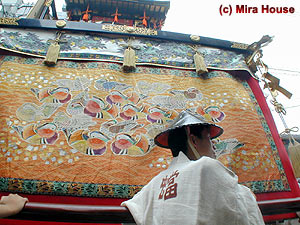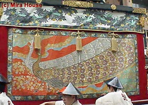 ![]() 109年ぶりの復活の際に新調した前懸・胴懸・見送は羽田登喜男作で,山鉾初の友禅染。 1999年に新調した水引も友禅。 |