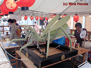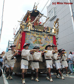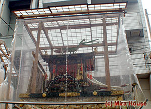 “かまきり山”とも呼び,屋根の上のからくりを施したカマキリがカマを振りあげて動く。 蟷螂山の起源は南北朝時代。足利義詮軍と戦い戦死した当町の四条隆資(たかすけ)卿の武勇ぶりを蟷螂に見立て,永和2(1376)年,四条家の御所車に蟷螂を乗せて巡行したのが始まりだ。 |