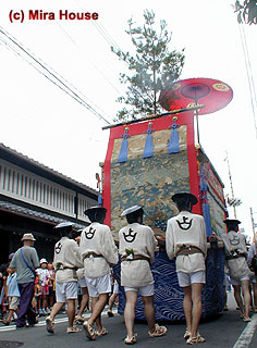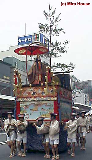 神功皇后(じんぐうこうごう・新羅遠征説話の主人公)が,九州・肥前の国松浦で鮎釣りをし,戦勝を占ったという伝説に由来し,釣り竿と釣り上げた鮎を持った人形は神功皇后の姿を表す。鮎釣山(あゆつりやま)の別名お持つ。 町衆に人気のあった山で,明治時代までは「あいわい山」という名で呼ばれていた。前懸と胴懸は日本三景を描いたもので,1991年に終了した胴懸の新調には十年の月日を費やした。水引は,在原業平など三十六歌仙を描いたもの。 安産のお守りを授与する。 |