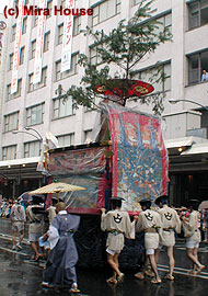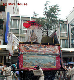 ![]() 雨の四条通を行く占出山。神功皇后もシートの中でよく見えない。 |