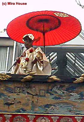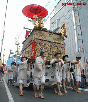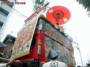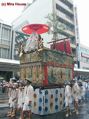 山鉾巡行に雨天順延はない。年によっては梅雨末期大雨にも見舞われる。 多くの山鉾はビニールシートをかぶせたり,雨仕様。 | |