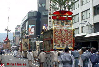 ![]() 巡行を終えた山鉾たちは,新町通の最初の交差点で散り散りになり,思い思い自分の町の方向へ帰っていく。 広い御池通では大きな鉾が後ろの山を先に通す様子が見られ,新町では,山鉾たちはクジで決まった巡行順とは異なった順序で現れる。 |
