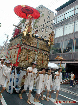 山に飾るご神体が,山伏の姿をしていることから山伏山と呼ばれる。 前(さき)の祭の中では一番北の山で,7月15日には聖護院の山伏が参詣し,八坂神社神官の後に祈祷を行う。明治初年の神仏分離以前の姿を残す山である。 |